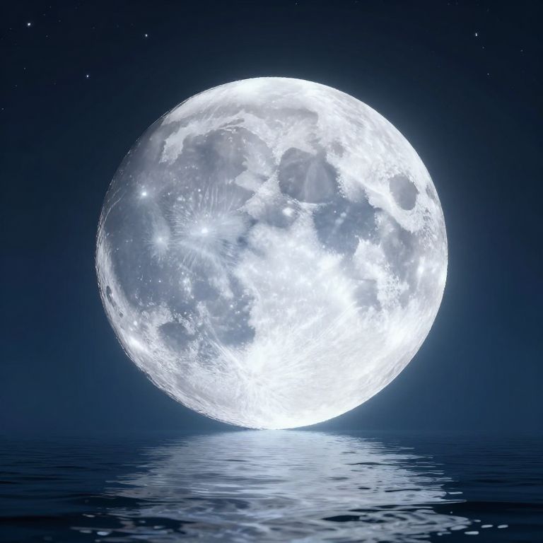 A digitally rendered, high-definition depiction of a luminous moon floating serenely over a tranquil sea, its surface adorned with intricate star-like patterns that mirror the celestial expanse above, evoking a sense of introspection and wonder in those who behold it.