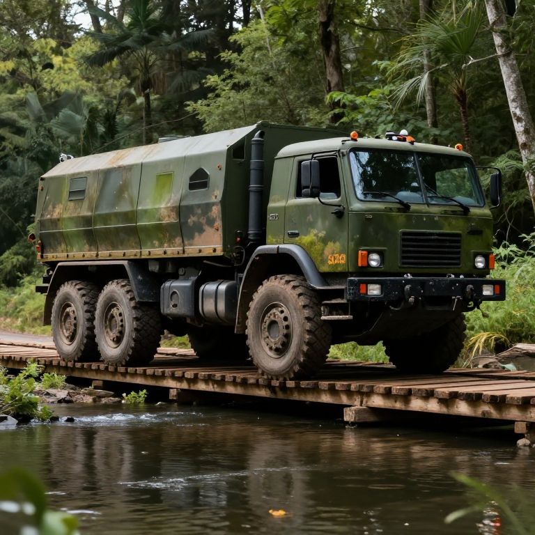Maz-7310 military heavy truck crossing river on a wooden bridge, dense forest background, reflections in water, moss and dirt on truck body, soft natural lighting, highly detailed textures and mechanical parts, realistic scene