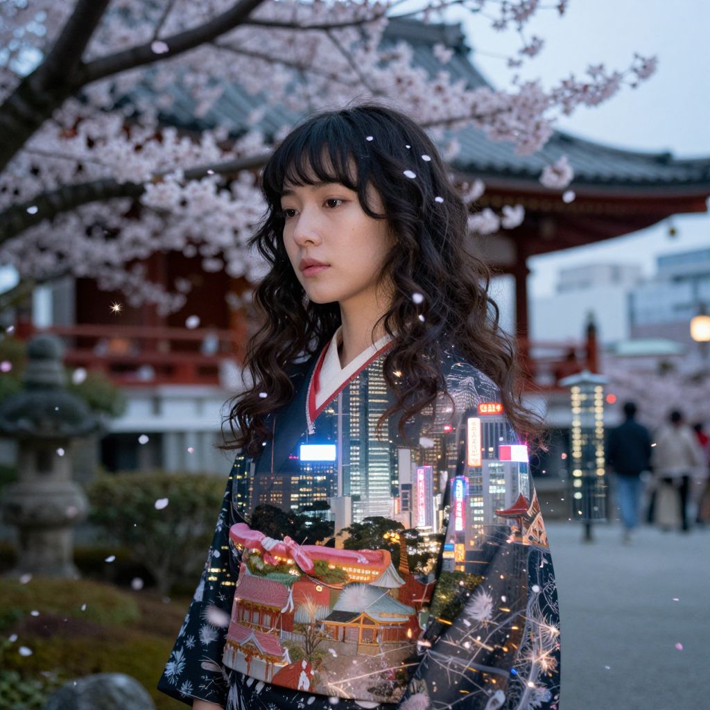 A captivating double exposure portrait showcases a woman of Eastern and Western heritage in her late twenties. She stands amidst an ancient Japanese temple garden where delicate cherry blossoms dance around her like ethereal feathers. The primary image captures her serene expression illuminated by soft light, enhancing her porcelain skin tone. Her dark, wavy hair falls gracefully to her waist in untamed tendrils. Overlaying this tranquil scene is a vibrant cityscape at night, with towering skyscrapers and bustling neon lights creating a stark contrast to the garden's serenity. The merging of these two worlds seamlessly intertwines around her figure; cherry blossom petals blend with flying sparks of light while architectural details of the temple merge into reflective glass facades. This unique portrait not only reflects her inner conflict between urban chaos and serene solitude but also invites viewers to explore their own duality, offering a captivating visual narrative.