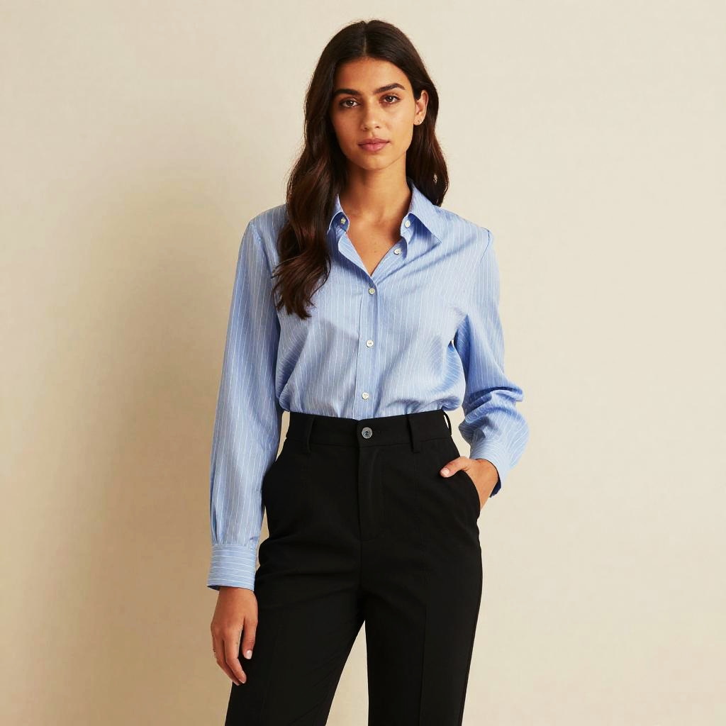 Photograph of a young woman with long, dark brown hair standing against a plain, light beige wall. She's wearing a light blue, pinstriped blouse with button details and high-waisted, black pants with side pockets. Her right hand is casually in her pants pocket, and she has a neutral expression. The lighting is soft, highlighting her relaxed, confident pose.