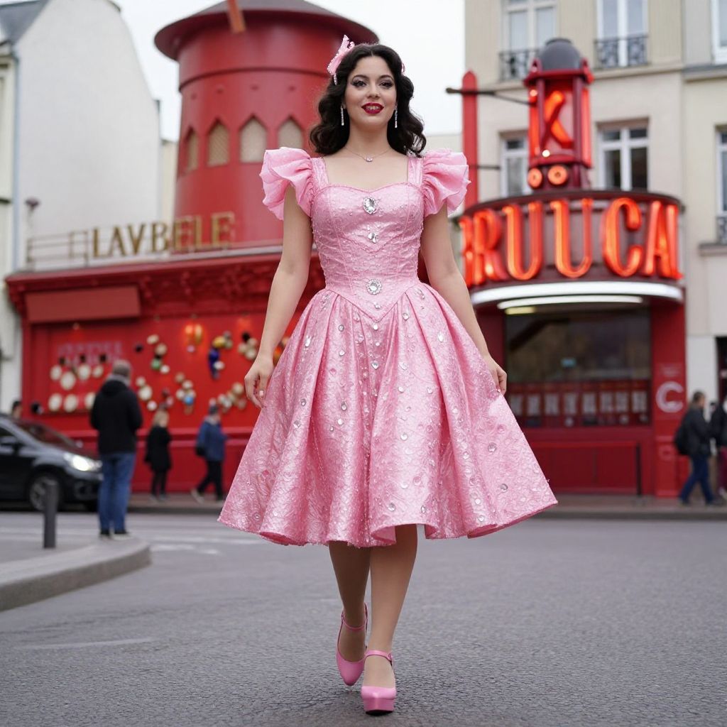 Moulin Rouge Pink Diamonds Costume, woman in pink dress and pink shoes walking down a street