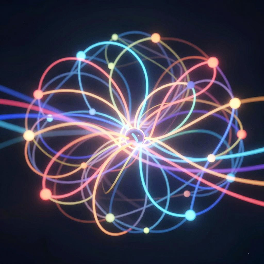 AI generate free abstract patterns that visualize neural networks and data streams, with bright glowing lines and nodes, creating a sense of complexity and depth, in a colorful and dynamic composition.