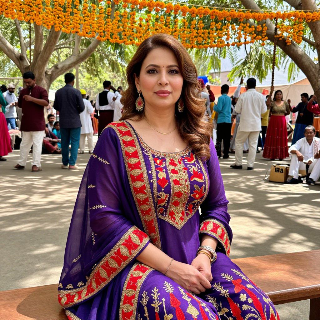 A graceful middle-aged woman with a slightly angled chin, soft pink lips, and brown wavy hair wearing a festive purple salwar costume with bold red and gold motifs, seated on a wooden bench at a cultural festival under a canopy of marigold and banyan tree shadows, surrounded by music and dancing villagers.. The woman has big tits and cute face