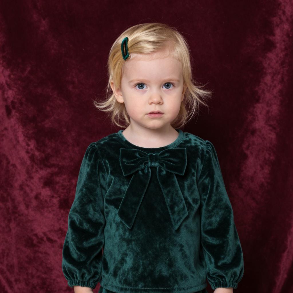 Portrait of a young blonde toddler girl with blue eyes wearing a dark green velvet top featuring a large bow and matching hair clip. She stands against a rich burgundy velvet backdrop, highlighting the luxurious textures of both the clothing and background.
