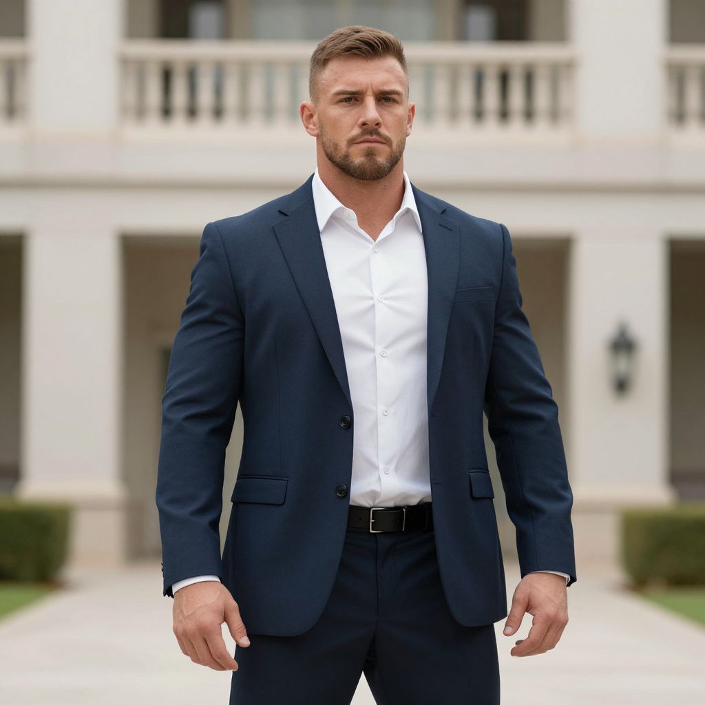 Photograph of a handsome Caucasian man with short, light brown hair and a well-groomed beard, standing in front of a modern, white building with balconies. He wears a dark navy blue suit with a white dress shirt, unbuttoned at the collar, and black trousers. His expression is serious and confident. The background includes blurred greenery and part of the building's facade. The image has a sharp focus on the man, with a shallow depth of field that blurs the background, highlighting the subject. The lighting is natural, emphasizing his clean-cut appearance and formal attire.