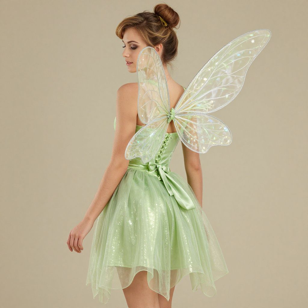 "Tinkerbell Sparkly Dress, a woman in a green dress with a fairy wings on her back"