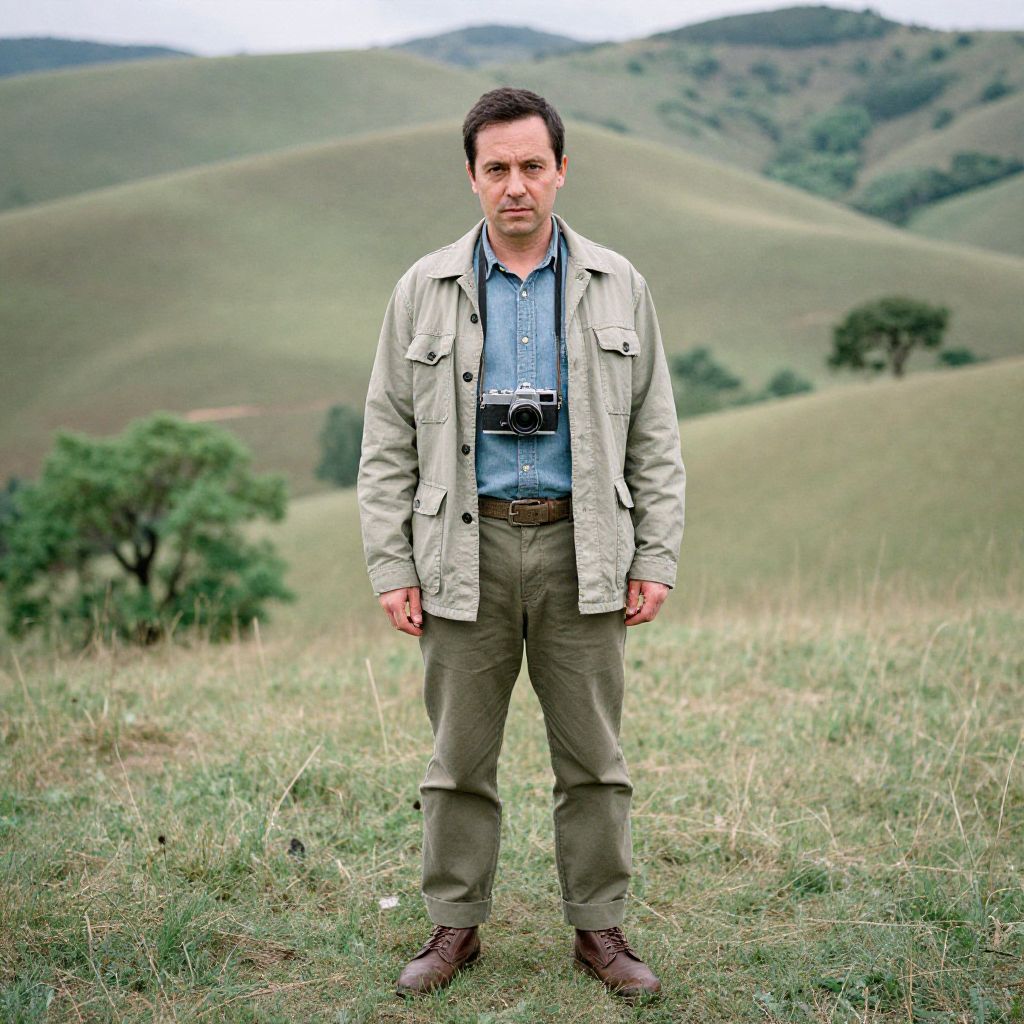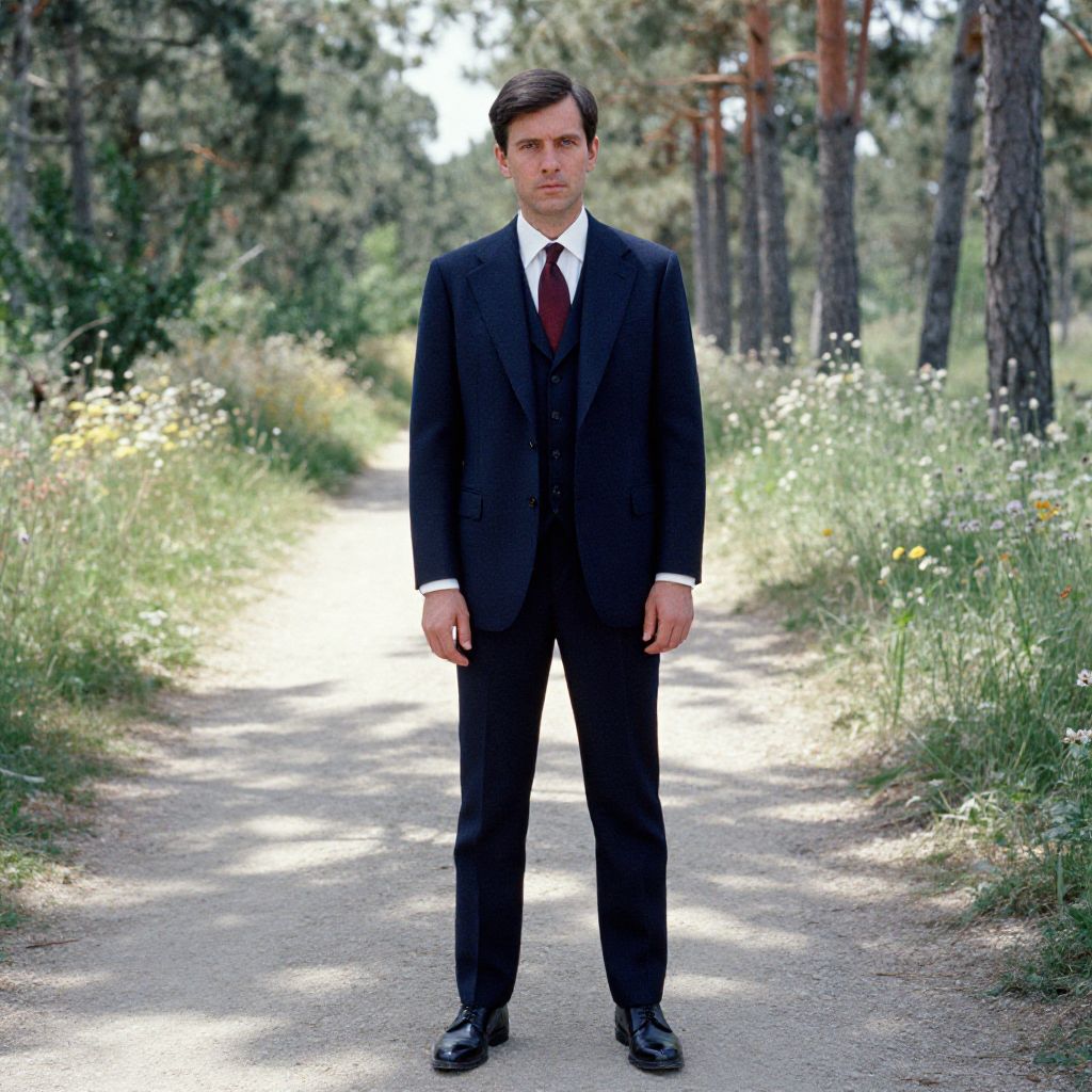 A man, burgundy linen suit, relaxed fit, black linen shirt, black patent leather oxfords, breathable texture, lush green valleys, shimmering glacial reflections, vibrant wildflowers in bloom, kodacolor analog film, contemplative expression. Man has masculine face and piercing eyes