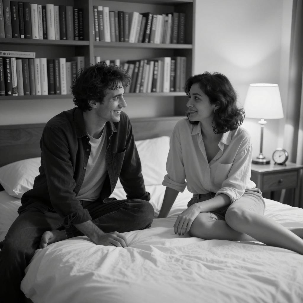 Black and white photograph of two people in a bedroom. Man with dark hair, wearing a dark jacket, sits on the left, smiling. Woman with dark hair, wearing a light shirt, sits on the right. Both look at each other. Bed with white sheets in the center. Bookshelf filled with books in the background. Small table with a lamp and clock on the right. Woman's legs visible, man's hand on the bed. Intimate, relaxed atmosphere.