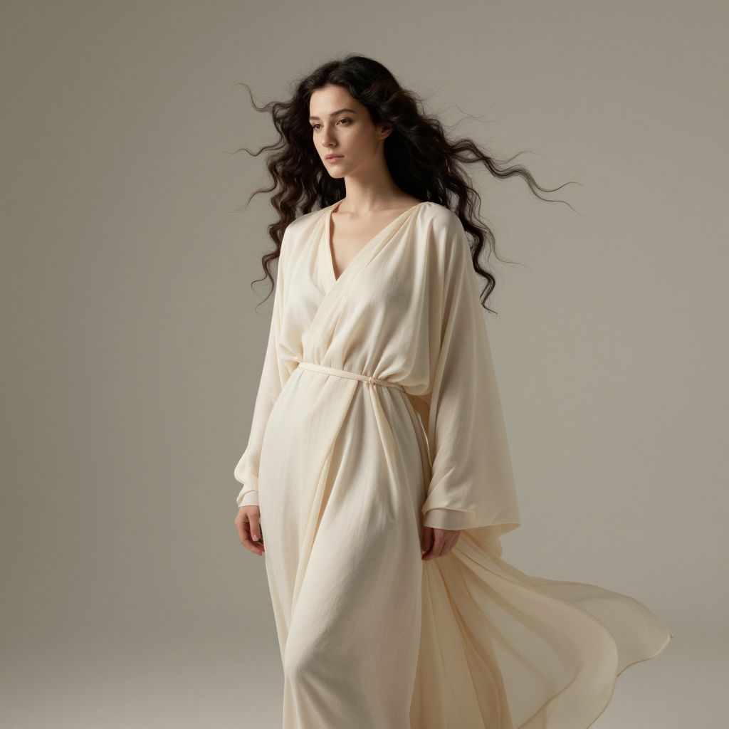 Photograph of a young woman with long, wavy black hair standing against a plain, light gray background. She has fair skin and is wearing a flowing, cream-colored, long-sleeved dress with a V-neck and belted waist. The dress has a soft, silky texture that billows slightly behind her. She gazes off to her left with a serene expression. The overall style is minimalistic and elegant, emphasizing natural beauty and simplicity. The lighting is soft, highlighting the gentle curves of her dress and her delicate features.