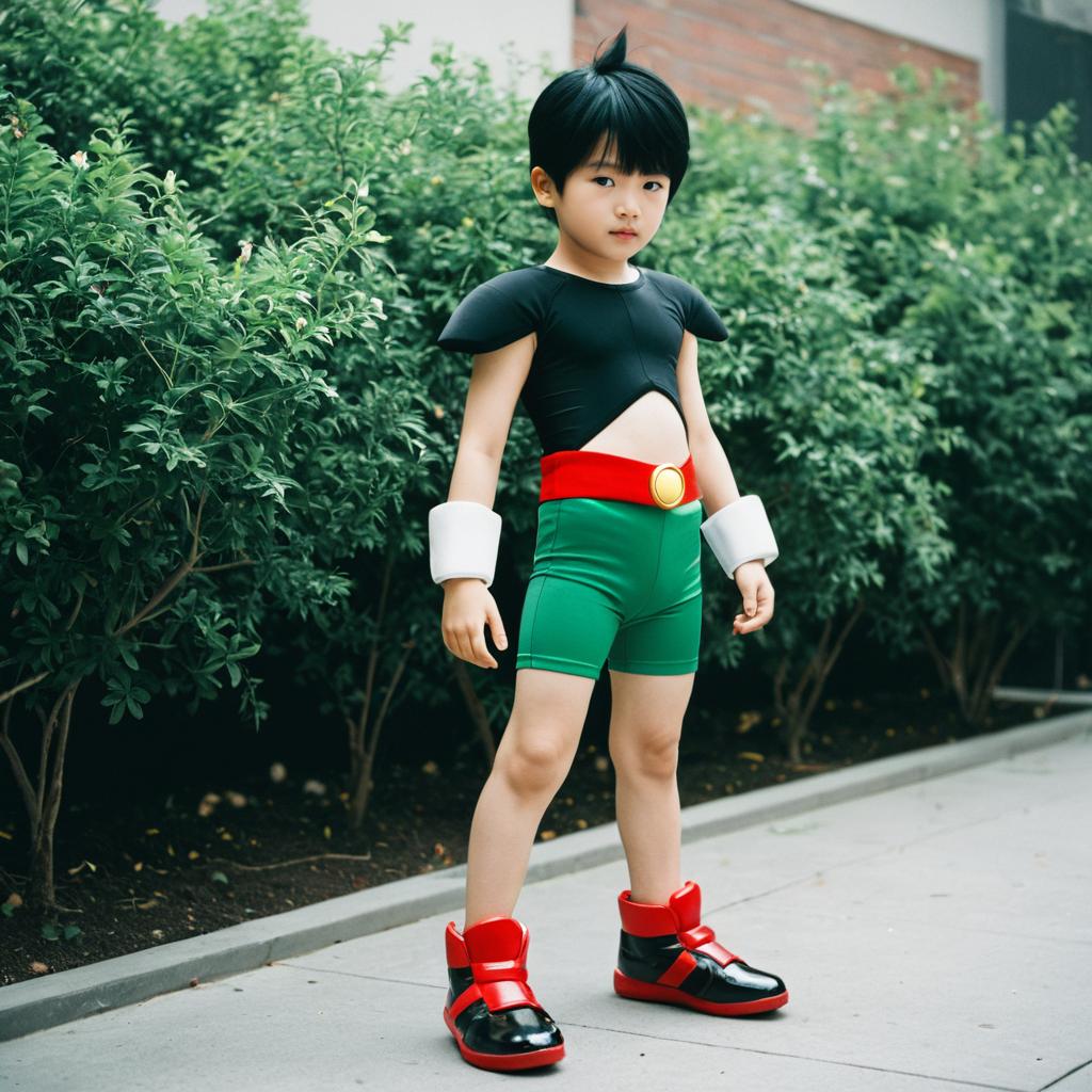 Astro Boy, young boy cosplay costume black pointed hair green trunks red footwear, bloom