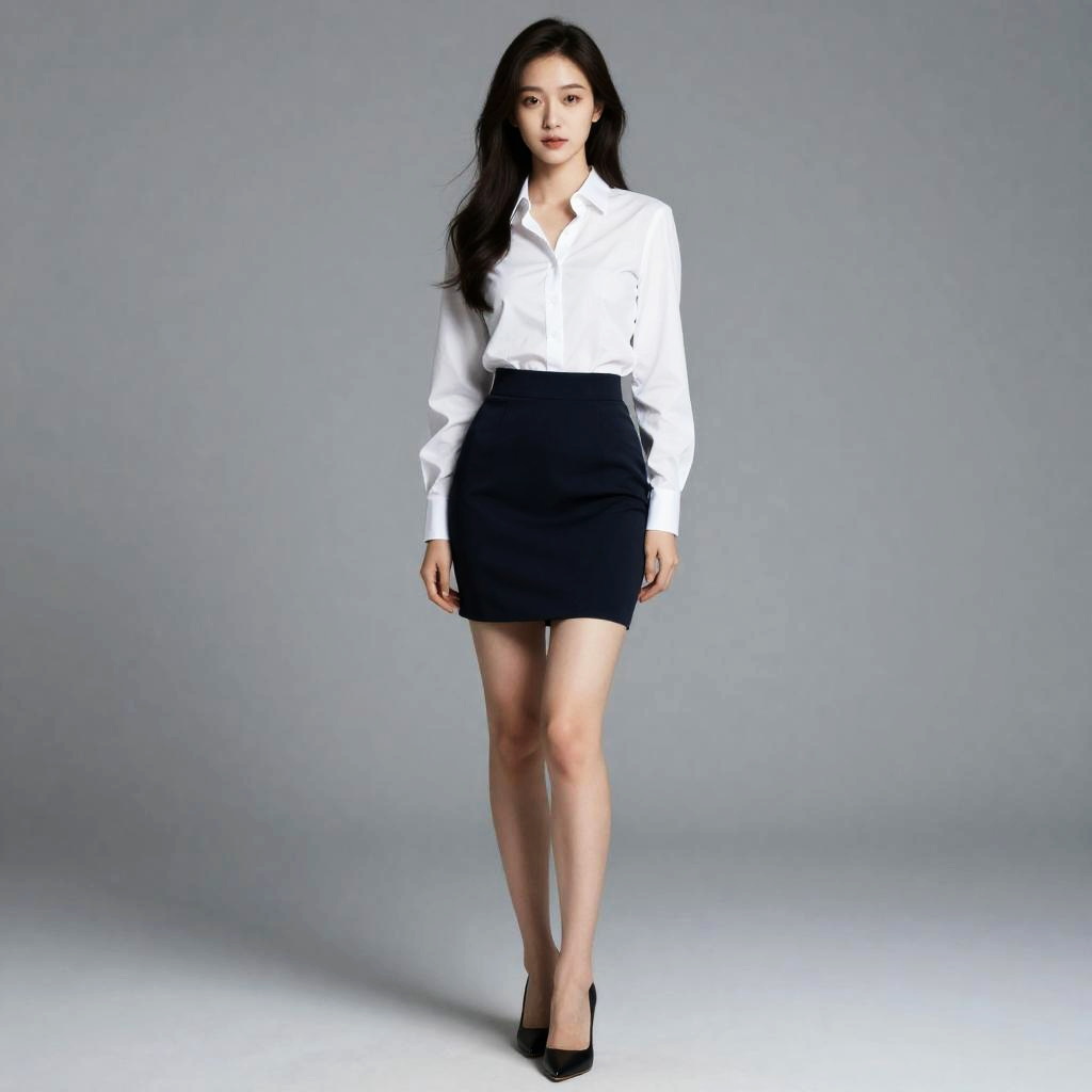 Photograph of an Asian woman with long black hair, wearing a white button-up shirt, black high-waisted skirt, and black heels, standing
