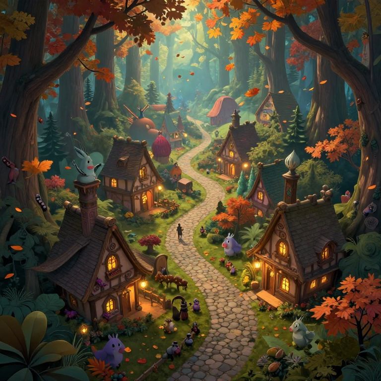 Enchanting forest village at sunset, featuring whimsical, fairy-tale cottages with glowing windows, winding cobblestone path, and vibrant autumn