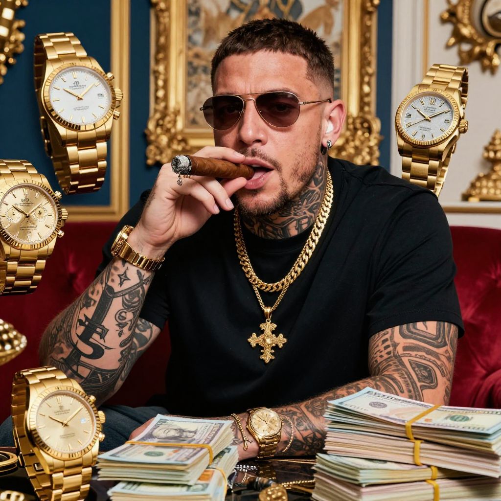 Andrew Tate with a cigar, surrounded by luxury items like gold watches and stacks of cash, opulent setting, vibrant colors, sharp and detailed visual style