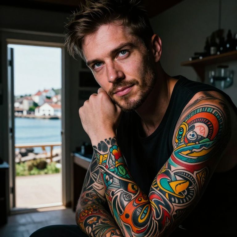 A captivating hyperrealistic portrait of an enigmatic tattoo artist from a small coastal town, their intense gaze and subtle smirk convey determination and passion for their craft. The unusual upward angle showcases intricate sleeve tattoos, with dim studio lighting emphasizing vibrant colors and intricate patterns. Dramatic shadows play across their face, contrasted by a soft glow from the open door, enhancing the artwork's vibrancy and capturing the essence of a true artist in their element.