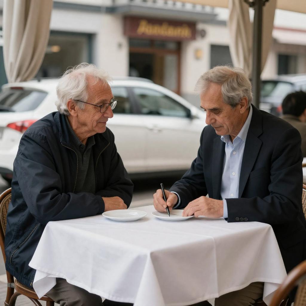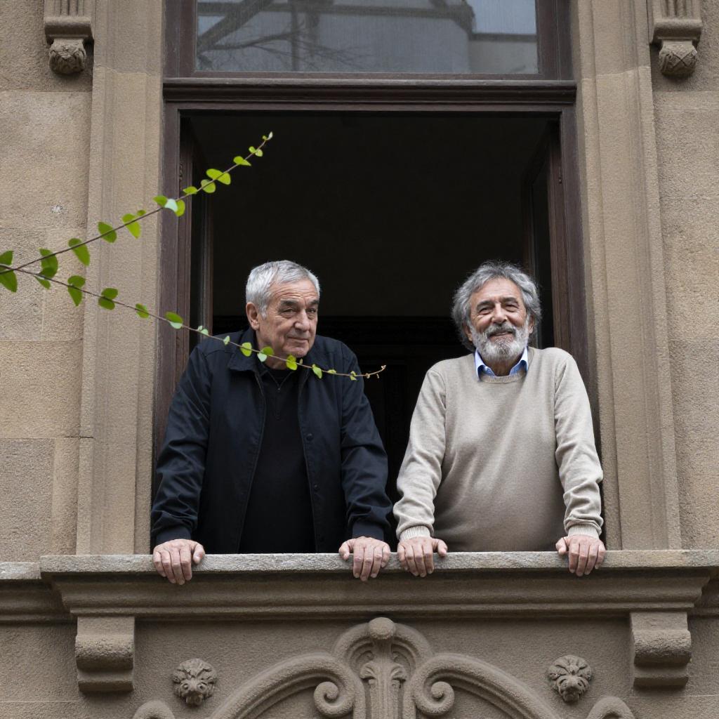 Photograph of two elderly men leaning out of a stone building window. The man on the left, with short gray hair, wears a black jacket and leans forward, partially obscured by green vines. The man on the right, with gray hair and a beard, wears a beige sweater and sits back, smiling. The window has ornate stone carvings.