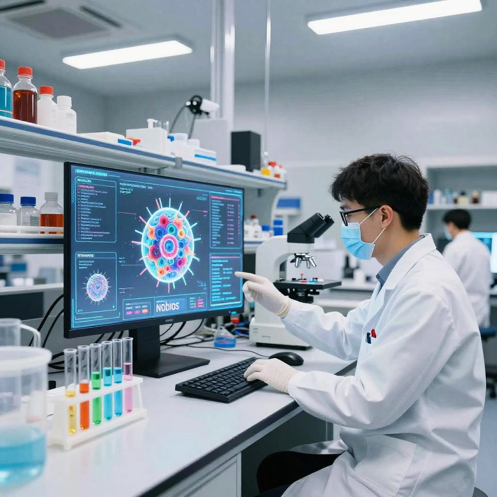 Nobios advanced biotechnology lab interior, clean and modern with holographic displays, scientists experimenting with living organisms, vibrant colored liquids in transparent tubes, dynamic lighting emphasizing precision and innovation