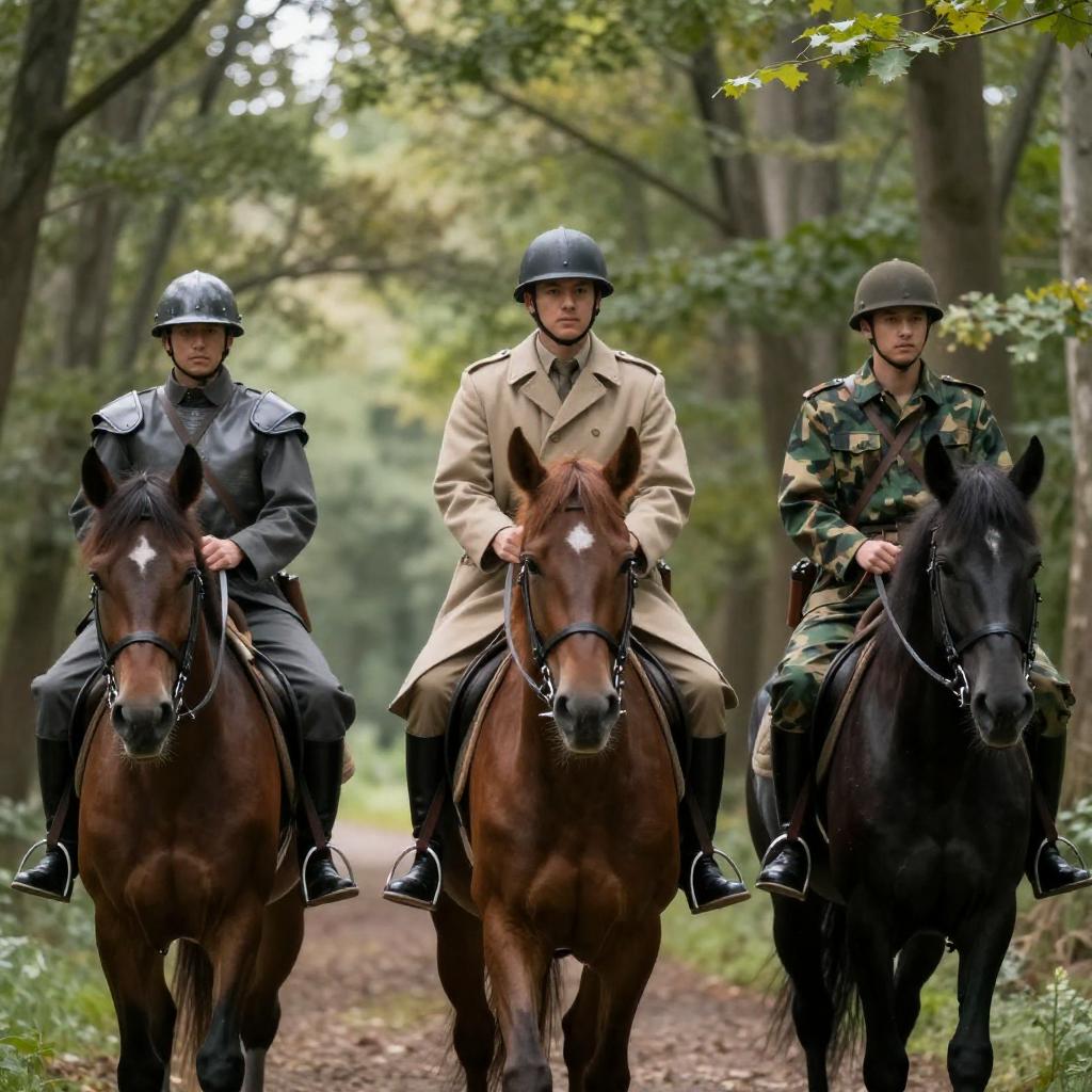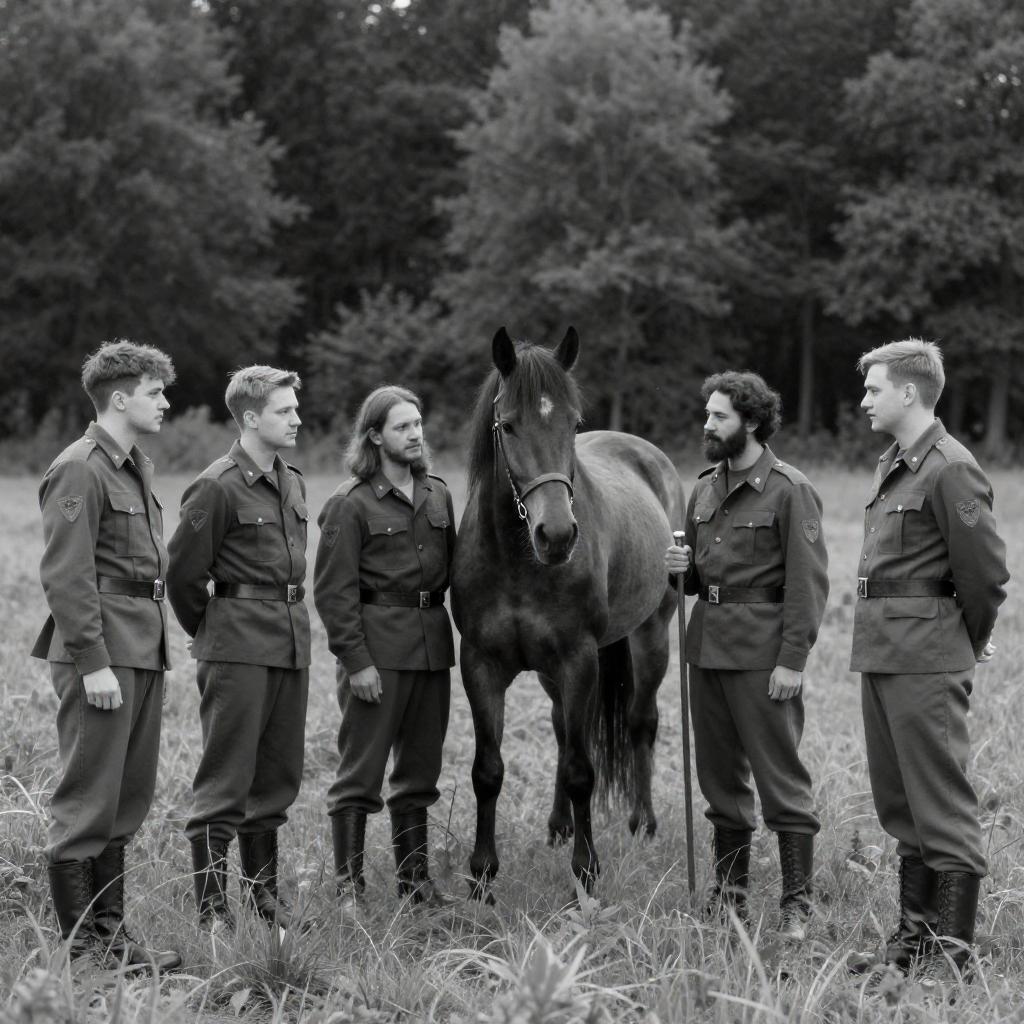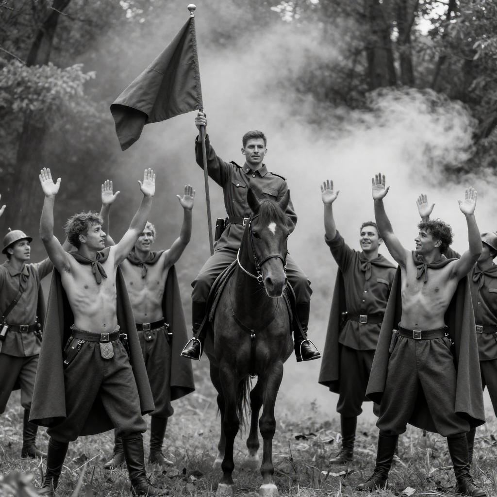 Black-and-white photograph of a group of people in a forest. Central figure, a soldier on horseback, raises a flag. Surrounding people, mostly shirtless and wearing long cloaks, raise arms in celebration. Soldier's expression is determined. Background includes trees and smoke. Multiple people, dynamic poses, festive atmosphere. Soldier's uniform contrasts with rustic clothing.