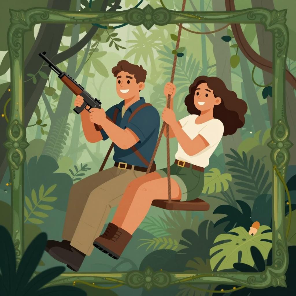 Adventurous Couple Swinging through Jungle