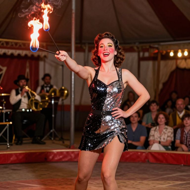 A vintage circus starlet in a bold, eye-catching sequin outfit performing a fire routine on a raised platform at a mid-century circus. Her face is energetic and radiant with rosy cheeks and lively eyes, full of life and movement. She has a natural, warm makeup with a subtle gold eyeshadow, and her black and silver sequin dress shimmers under the glow of a red spotlight. The background features a rustic circus scene with a vintage band playing a brass ensemble, and the audience watching in awe.