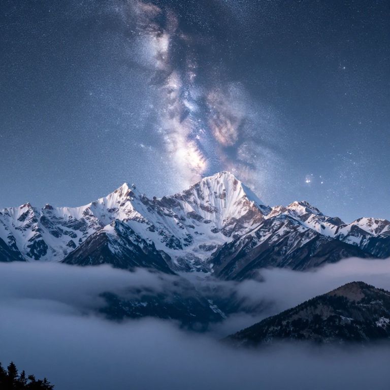 Photograph of a snow-capped mountain range under a starry night sky with the Milky Way prominently visible, surrounded by clouds.