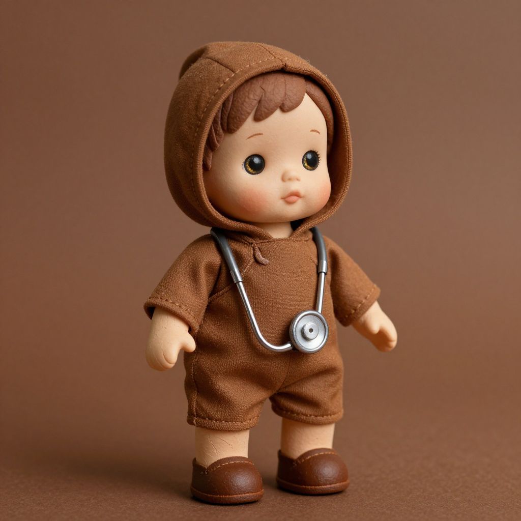 A child's doll standing on a brown surface, wearing a brown outfit with a hood and a stethoscope hanging from the front, brown shoes on its feet, with a gentle, expressive face that conveys curiosity and innocence, soft glowing eyes, and a slightly tilted head as if listening to something, rendered in a warm, detailed style with subtle textures to emphasize the doll's handmade quality and nostalgic charm.