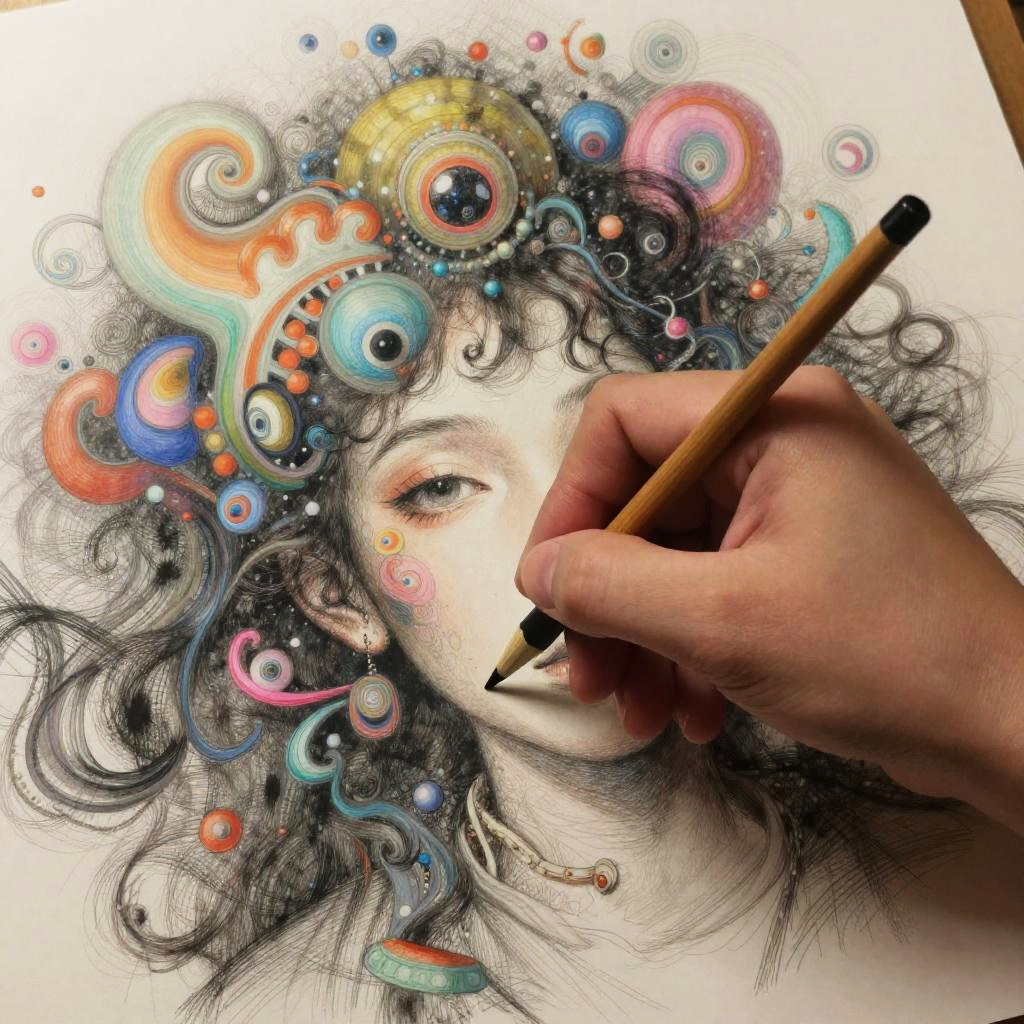 Drawing with AI inspired image, fusion of traditional hand sketching blending seamlessly into AI generated digital art, brush meeting pixel, surreal morphing shapes and colors, dreamy atmosphere, dynamic mixture of old and new creative methods, richly detailed
