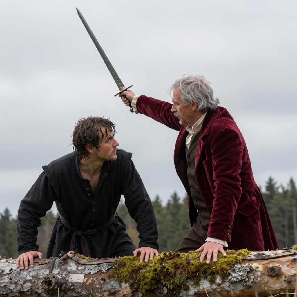 A man with blonde hair and a mustache points a dueling sword at another man with blonde hair. The man being pointed at holds a similar sword, facing left. They are in a grand hallway with white and gold walls, checkered floor, and large paintings in the background. The man pointing wears a black coat with a white shirt. Both men have intense expressions. Two people. The man pointing is on the right, the other on the left.