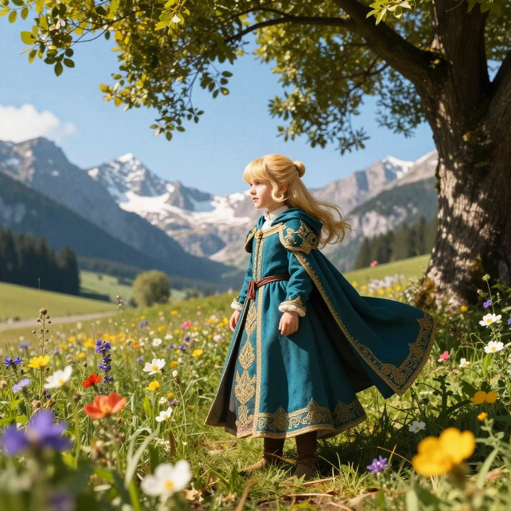 Zrpgstyle, AS-YoungerV2 DollieNobodySD15 medieval child princess teal dress, elaborate, ornate, adventurer cape, (blonde hair, top pony tail:1.1), standing in a tall field of flowers, tree canopy overhead (alpine mountains:1.1), clear sky, (masterpiece:1.3) (best quality) (detailed) (8k) (HDR) (cinematic lighting) (sharp focus) (intricate) (intense action scene, dutch angle, foreshortening, motion blur, blurred foreground:1.3)