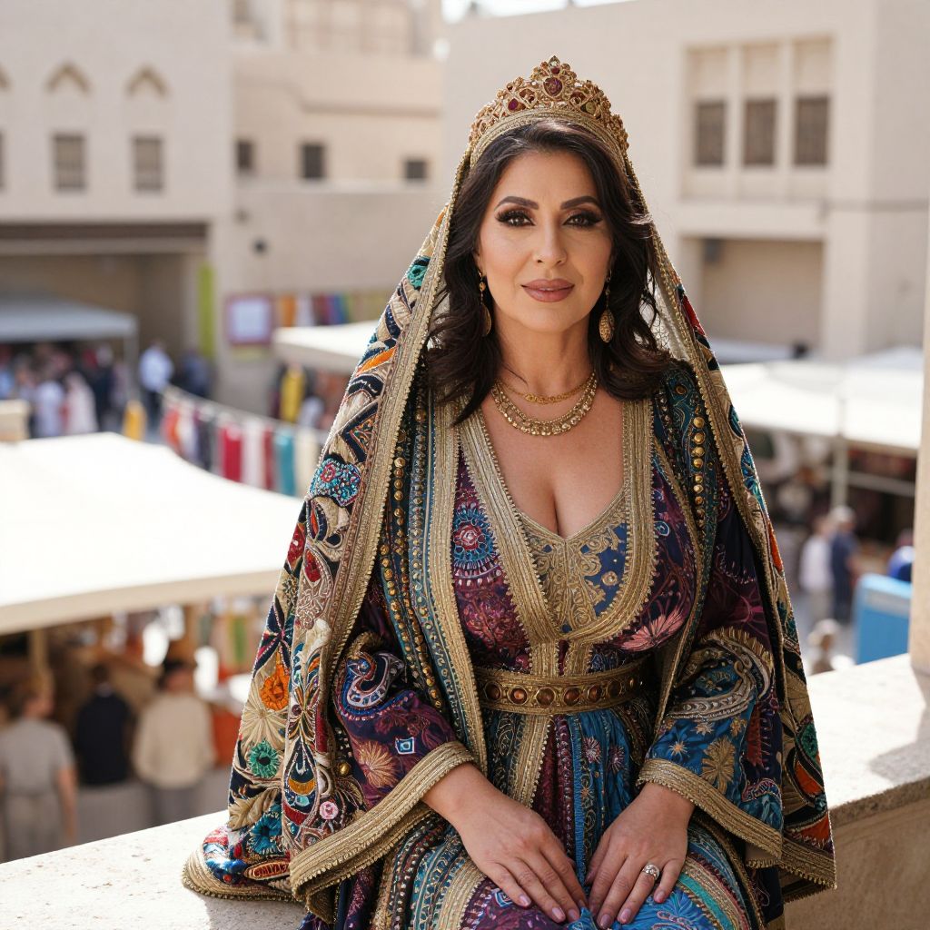 Photograph of a mature Arab woman dressed in an elaborate Arabian costume featuring a richly colored, multi-layered gown with brass detailing, a detailed qamar (crown) and a long embroidered shawl, sitting on a stone balcony overlooking a traditional Arabic marketplace during daytime, soft shadows, natural facial features, deep brown eyes, full lips, realistic skin texture. The woman has big breasts and cute face