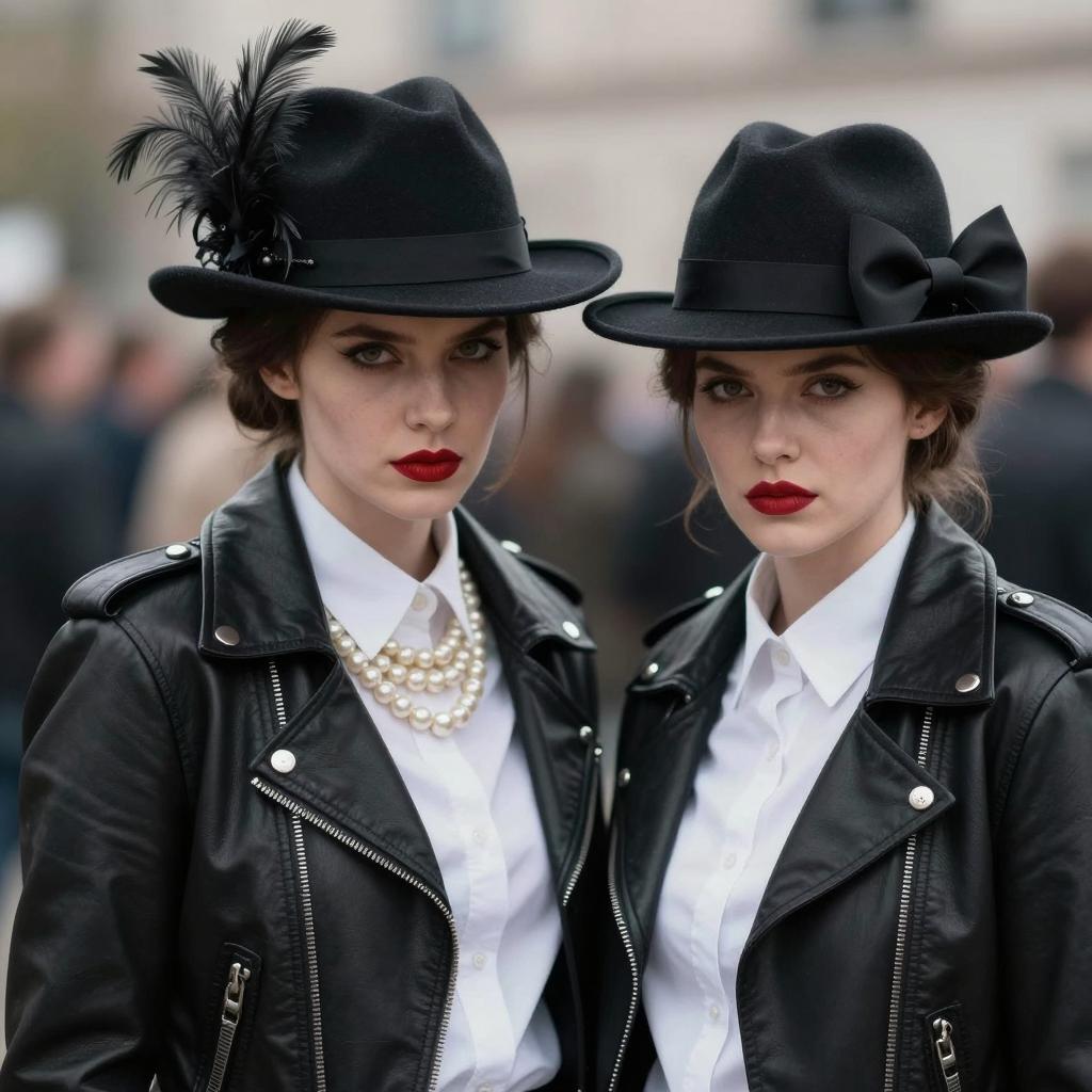 Two Women in Black Leather Jackets and Hats
