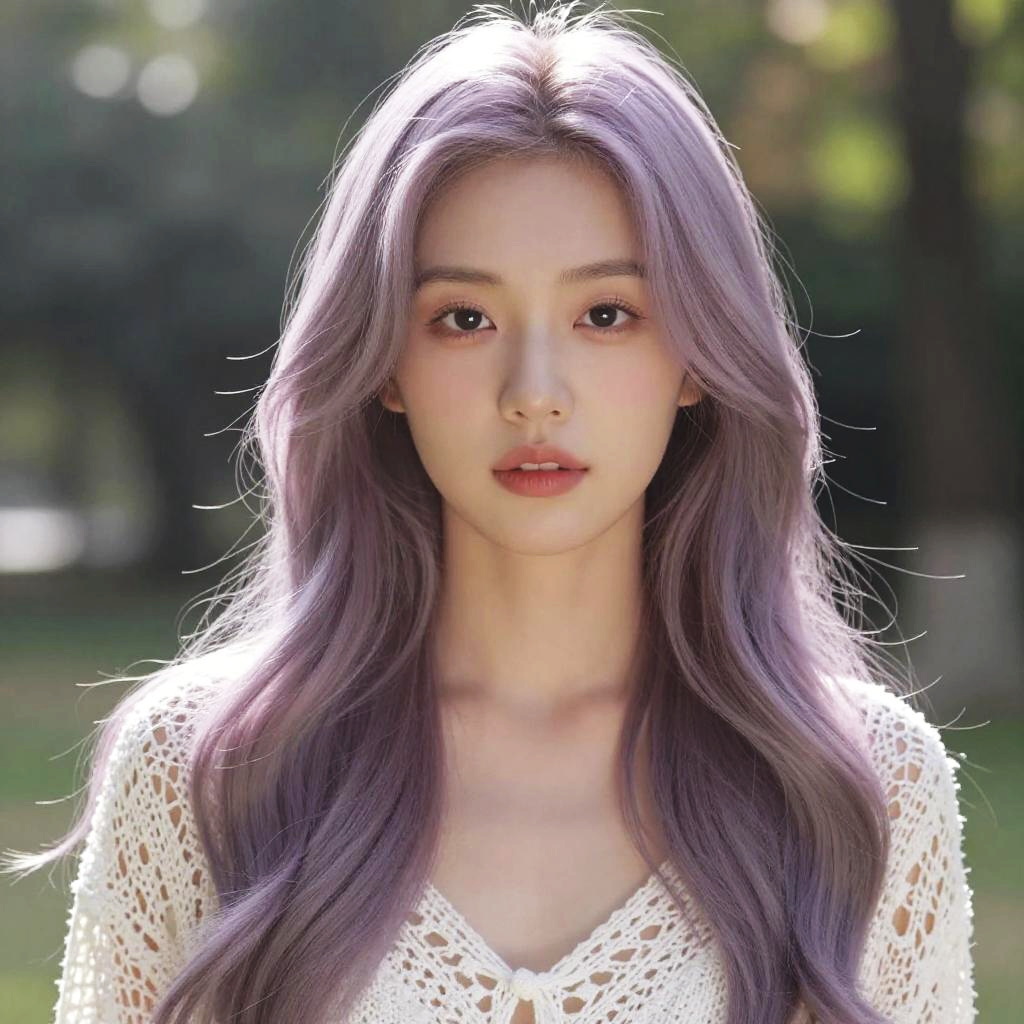 Photograph of an East Asian woman with long, wavy, pastel purple hair that falls over her shoulders. She has fair skin, delicate features, and is wearing a white, crochet-style top with a V-neck. Her light pink lipstick contrasts with her neutral makeup. The background is blurred, featuring greenery and sunlight filtering through trees, creating a serene, natural setting. The lighting highlights her hair and face, giving a soft, ethereal glow.