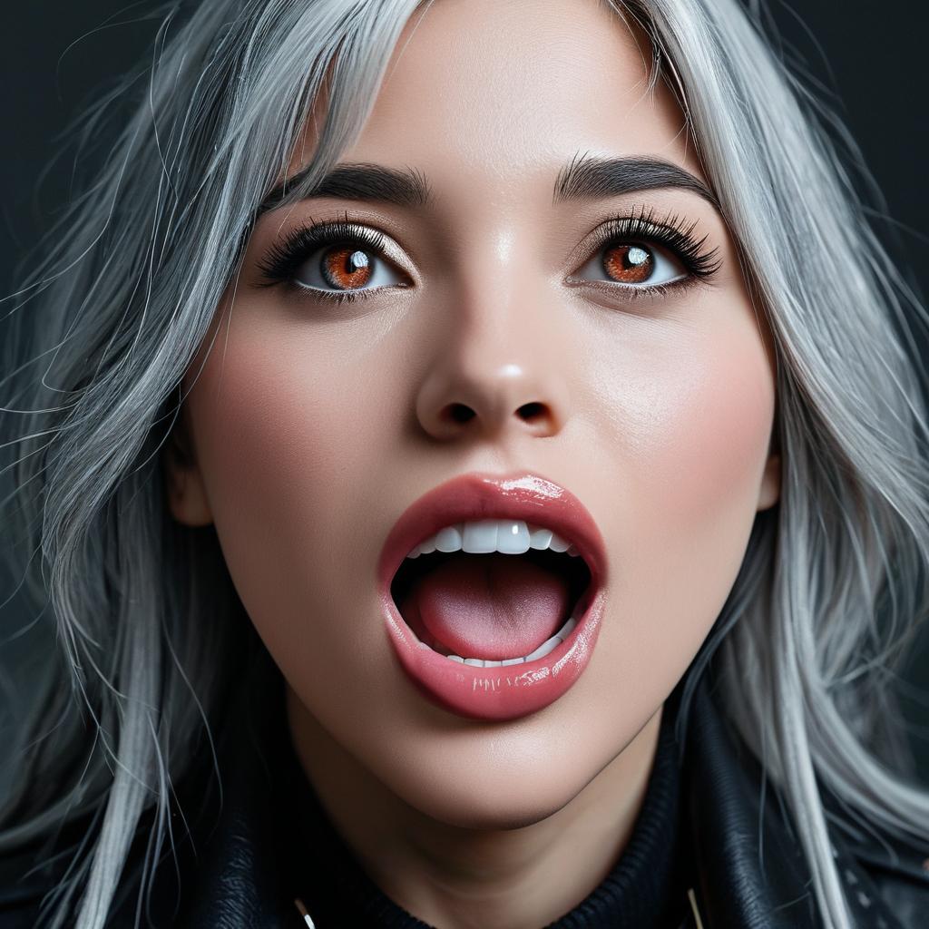 (masterpiece), 1girl, (best quality), solo girl, open mouth, saliva, uvula, [beautiful teeth], grey hair, black jacket, pink eyes