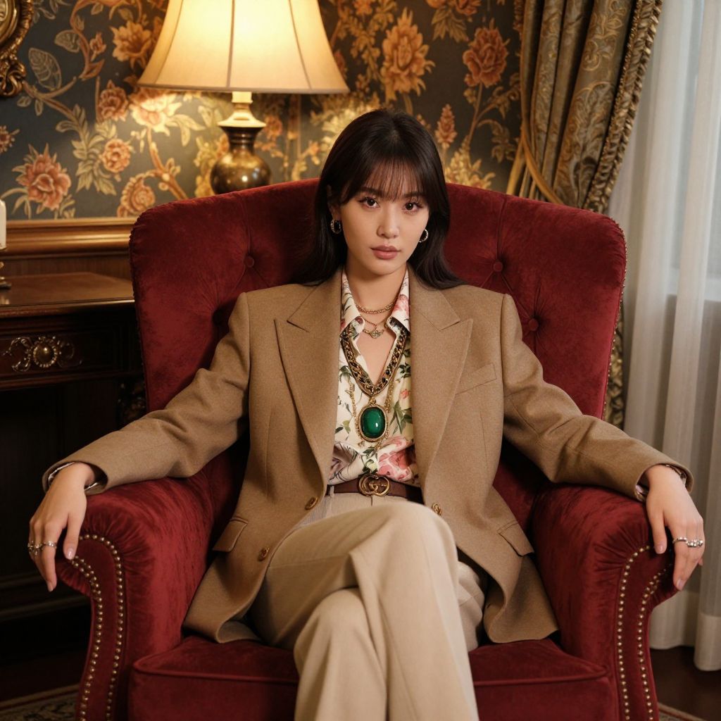 Elegantly seated in a plush red tufted armchair, a woman dons a sophisticated Gucci ensemble featuring a tan blazer over a floral-patterned blouse, complemented by layered necklaces and a green pendant, illuminated by a warm, vintage-style lamp in a richly decorated room with floral wallpaper and curtains.