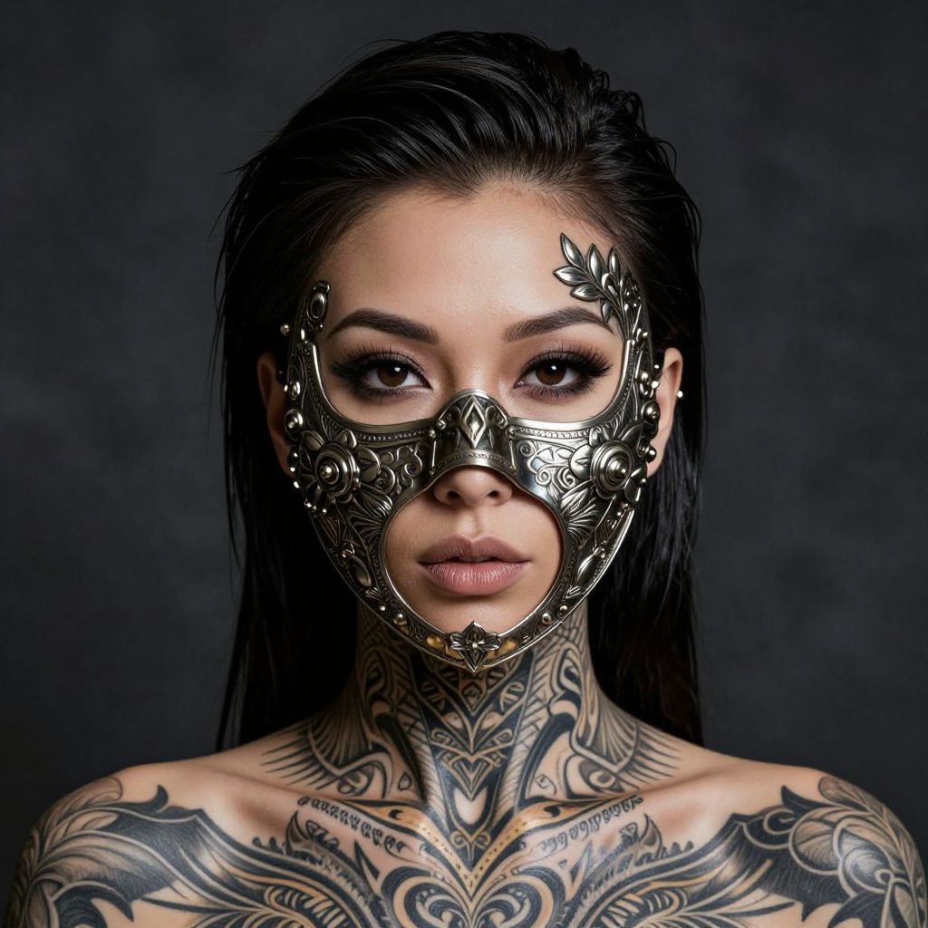 The image features a strikingly detailed portrait of a woman with a tattooed smooth metal face mask. Her dark, shoulder-length hair is styled in a sleek, side-swept manner, adding a modern touch to her appearance. The face mask, which covers her entire face, is adorned with intricate floral and geometric patterns, showcasing a blend of organic and mechanical elements. The mask's design is highly textured, with a rich, metallic sheen that reflects light, giving it a three-dimensional appearance. The woman's neck and shoulders are also tattooed, with similar ornate designs that seamlessly integrate with the mask, creating a cohesive and elaborate look. The background is a dark, textured surface, which contrasts sharply with the woman's lighter skin and the metallic sheen of her mask, drawing attention to her detailed features and the intricate patterns on her face and neck. The overall composition is balanced, with the woman's face and mask as the central focus, surrounded by the dark, textured backdrop that enhances the visual impact of her detailed tattoos and the metallic mask.