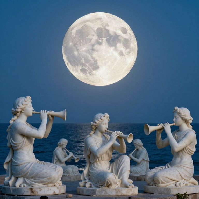 A serene assembly of marble statues, frozen in the act of playing ethereal instruments, sits by the moonlit sea, their forms bathed in the luminescent glow of a massive, cratered moon that looms like a celestial sentinel over the tranquil scene.