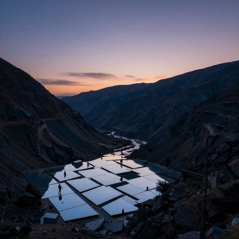 Twilight over a valley of whispering mirrors, where reflections show glimpses of impossible versions of people and events.