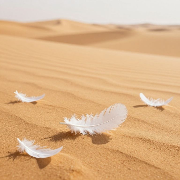 Amidst the vast expanse of golden sands, delicate white feathers drift like whispers of freedom, embodying the ephemeral dance between serenity and solitude, where dreams take root in the quiet embrace of the desert's eternal silence.