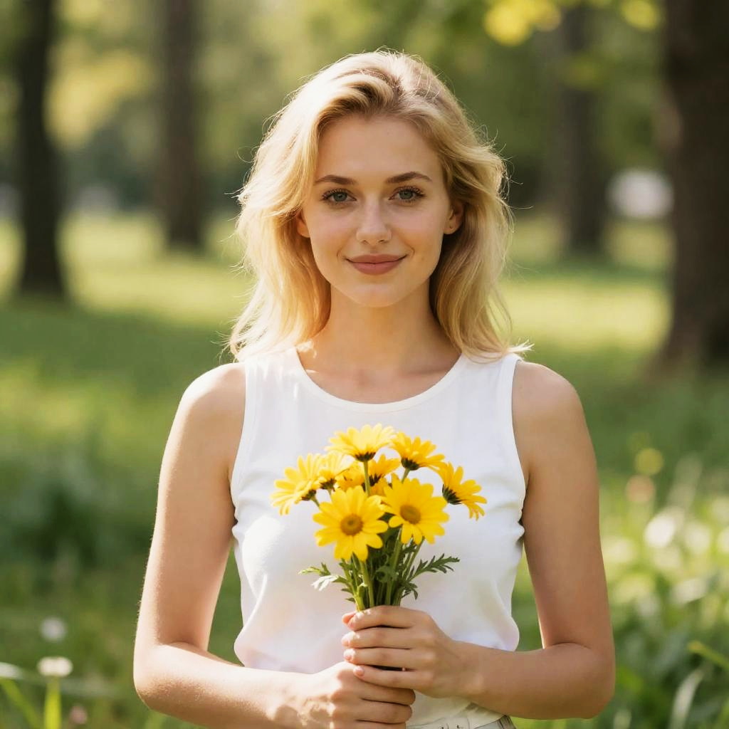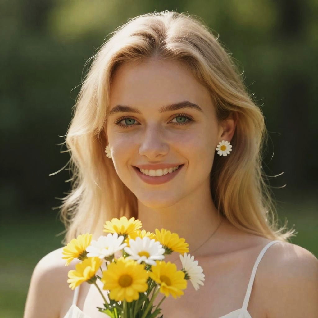 Photograph of a blonde woman with fair skin and green eyes, smiling, holding a small bouquet of yellow and white flowers. She wears a daisy earring in her right ear. Sunlight illuminates her face and hair. Blurred green forest background. Upper body and face in focus.