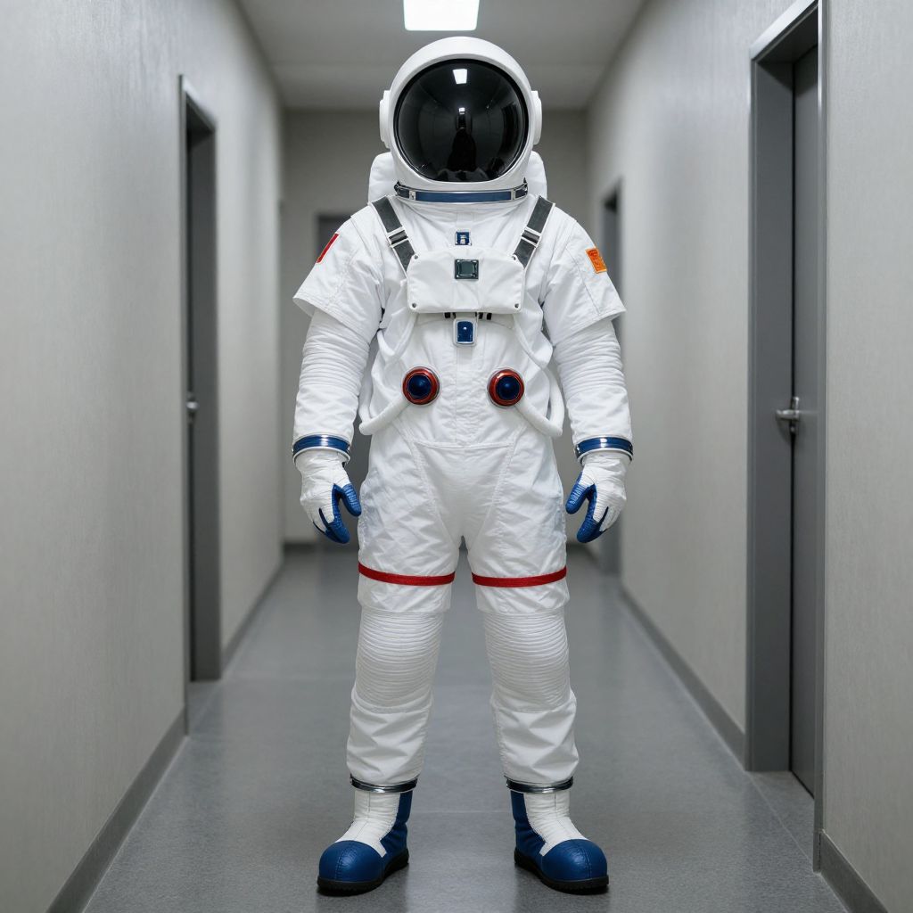 Photograph of a person in a white astronaut suit with black helmet, blue gloves, and red stripes, standing in a sterile, gray hallway with closed