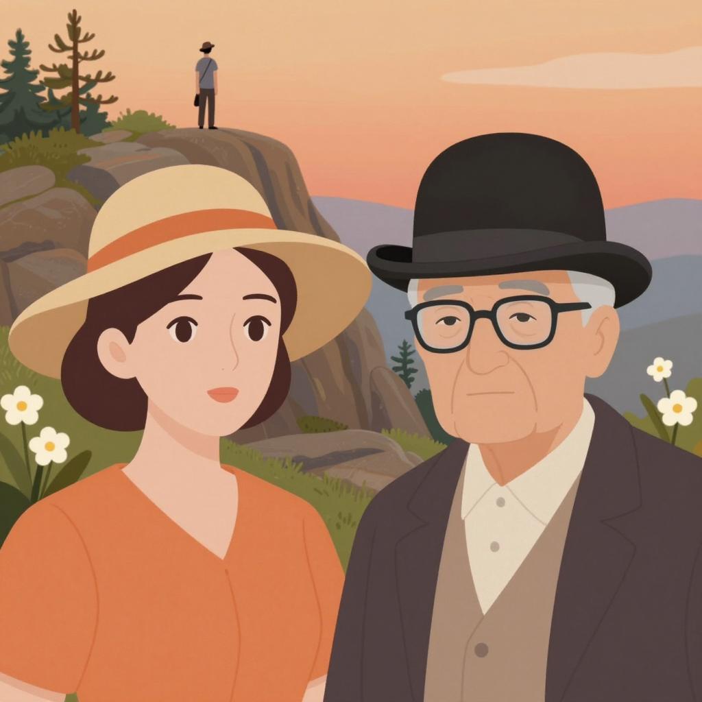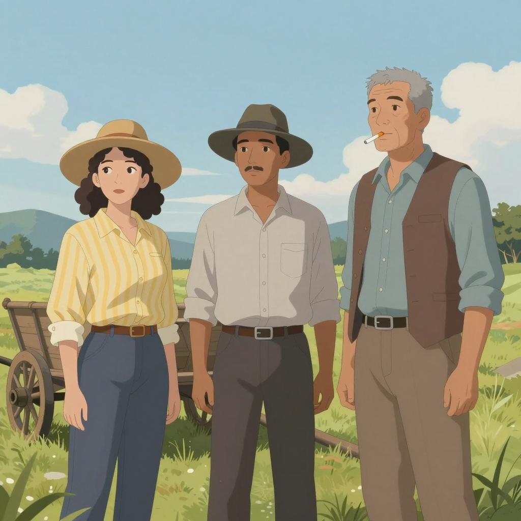 Illustration of three people in a rural field. A woman with dark curly hair, wearing a yellow striped shirt and wide-brimmed hat, stands on the left. A man with short dark hair, wearing a grey shirt and hat, is in the center. A man with grey hair, wearing a blue shirt and brown vest, with a cigarette in his mouth, stands on the right. A wooden wagon is in the background. The sky is blue with light clouds. The style is realistic with soft colors.