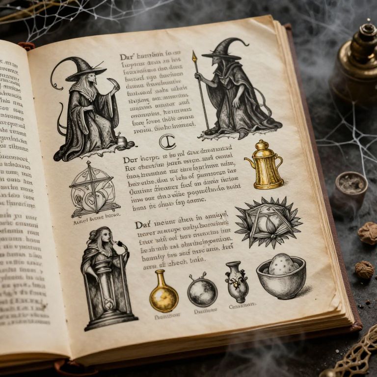 Illustrated open book with black-and-white witch illustrations, magical symbols, and potions on a smoky, mystical, dark-hued background.