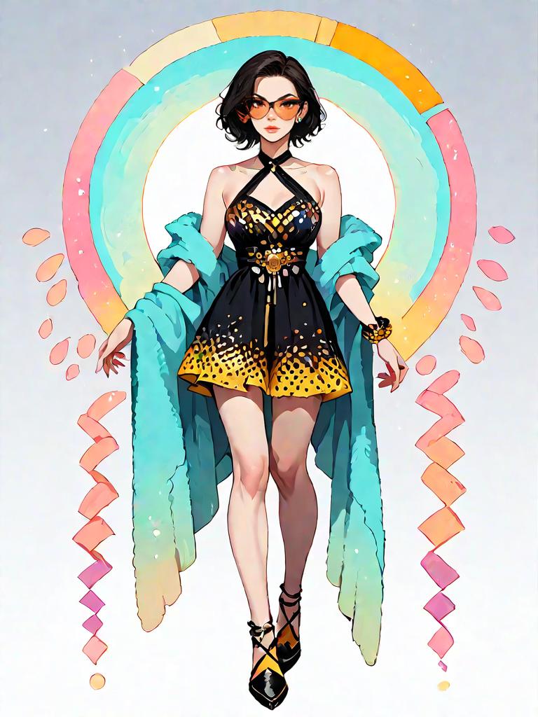 1girl, source_comics, realistic face, full body shot, Woman, summer clothing, sleeveless halter neck mini dress with animal print in shades of brown and cream, loose fit, keyhole back detail, asymmetrical hemline, layered bracelets in varying shades of gold and bronze, subtle makeup.