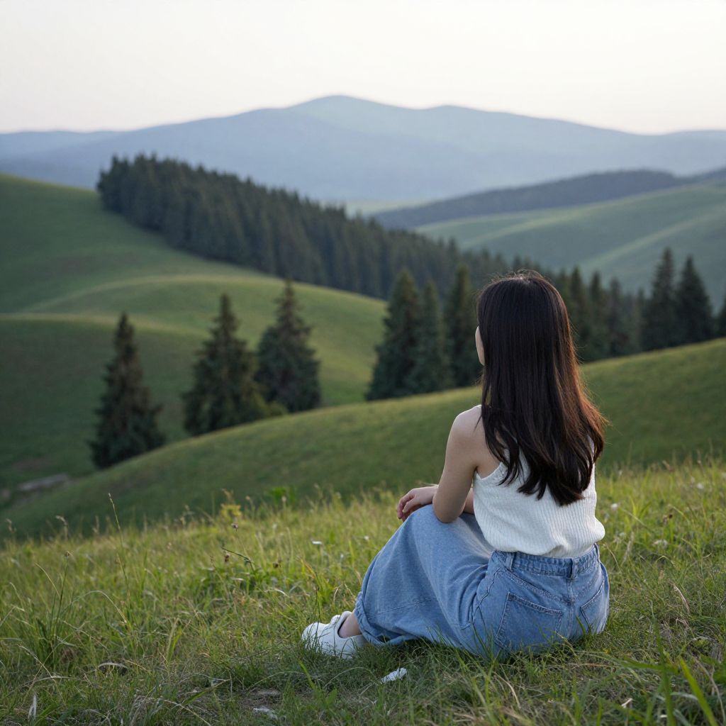Contemplative woman seated on a grassy hillside, gazing out over a serene landscape of rolling green hills, dense evergreen trees, and distant mountains under a soft, hazy sky.
