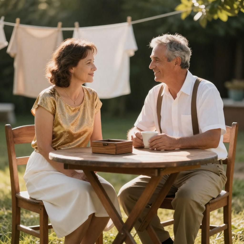 Photograph of a middle-aged man and woman sitting outdoors at a wooden table. The woman wears a gold ured top and white skirt, the man a white shirt with brown suspenders and khaki pants. Both smile at each other. Sunlight casts a warm glow. Wooden chairs, a clothesline with white garments, and a grassy background are visible. The man holds a cup, and a wooden box sits on the table.