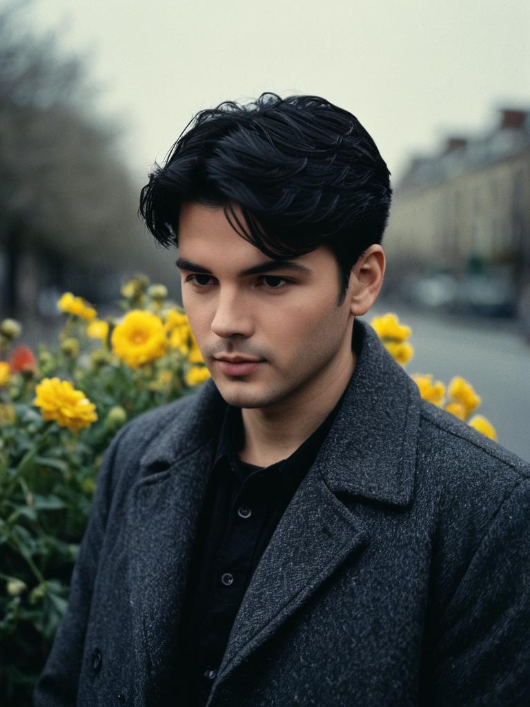 Man overcoat, 1boy, male focus, solo, realistic, flower, blurry background, blurry, black hair, coat, upper body, jacket, outdoors, short hair, shirt, looking at viewer, closed mouth, black shirt