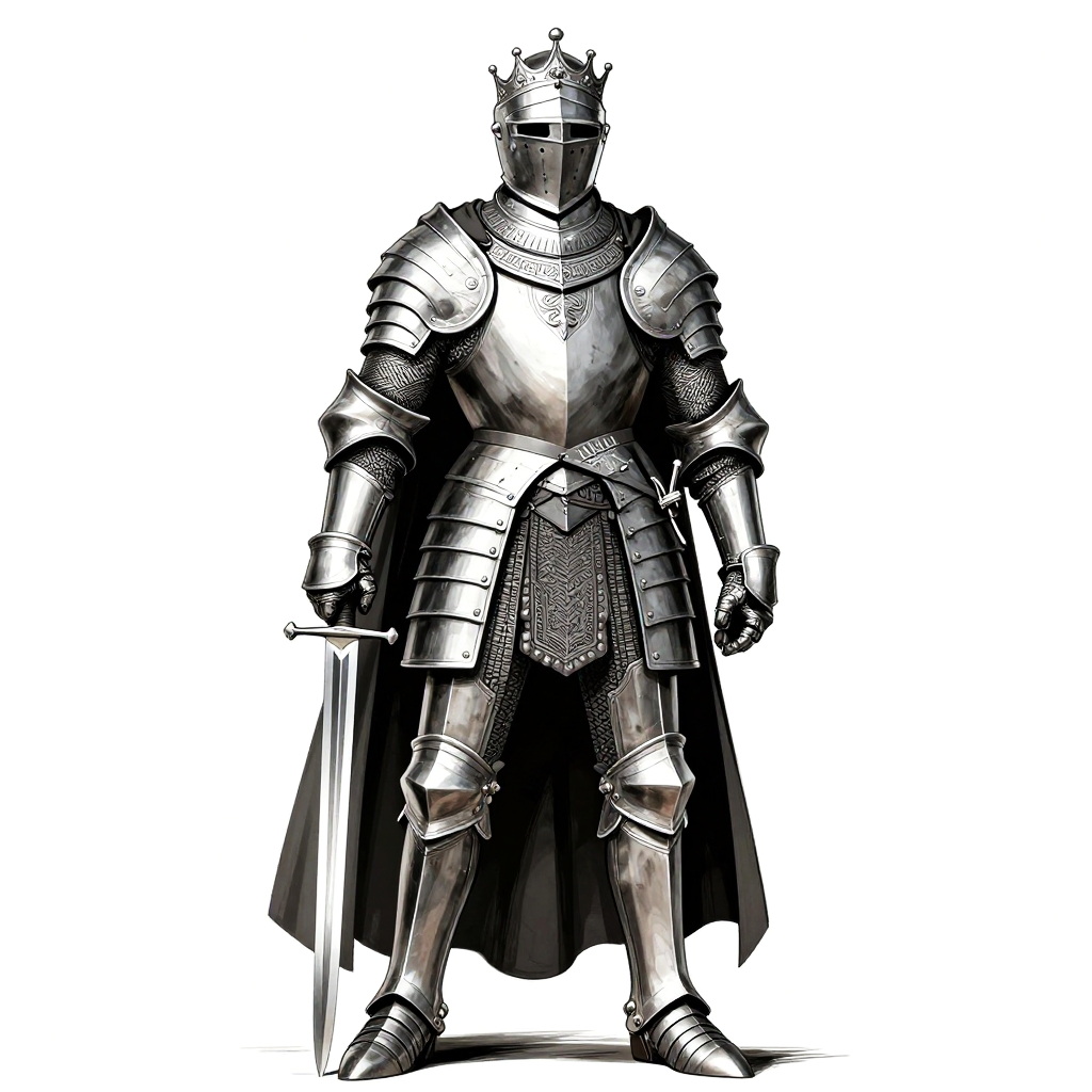 Digital illustration of a full-armored knight standing upright, facing forward. The knight wears a steel crown, a full suit of shining, intricately detailed plate armor with overlapping metal plates, and a long, flowing black cape. The armor includes gauntlets, shoulder pauldrons, and greaves. The knight holds a long, straight sword in the right hand, with the blade pointing downward. The background is plain white, highlighting the metallic sheen and texture of the armor. The style is highly detailed and realistic, with strong contrasts between light and shadow, emphasizing the knight's imposing and regal presence.