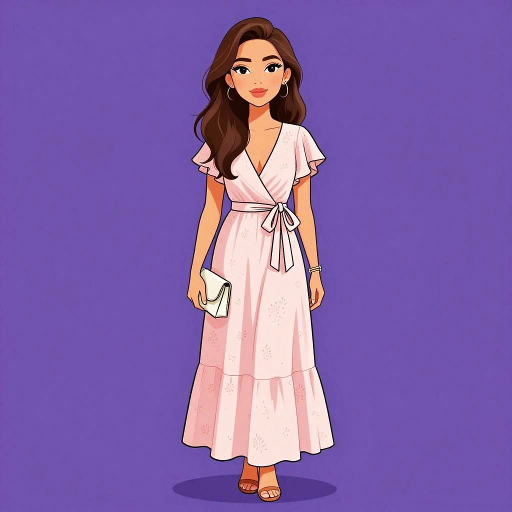 Plunging neckline, maxi wrap dress, lightweight chiffon, soft blush pink, tiered layers, adjustable waist tie, flutter sleeves, subtle floral print, ankle-length, complemented by nude sandals, minimalistic bracelet, chic clutch. --sref 1461