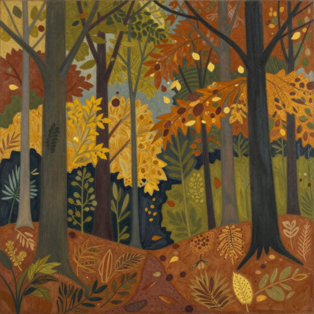 An old cobblestone street, rendered in the style of Henri Matisse, featuring bold outlines and a flattened perspective. The scene captures lampposts, ivy-clad walls, with a vibrant, cheerful palette of warm brown, olive green, and cream, and decorative patterns inspired by nature, creating a dreamlike and harmonious atmosphere.