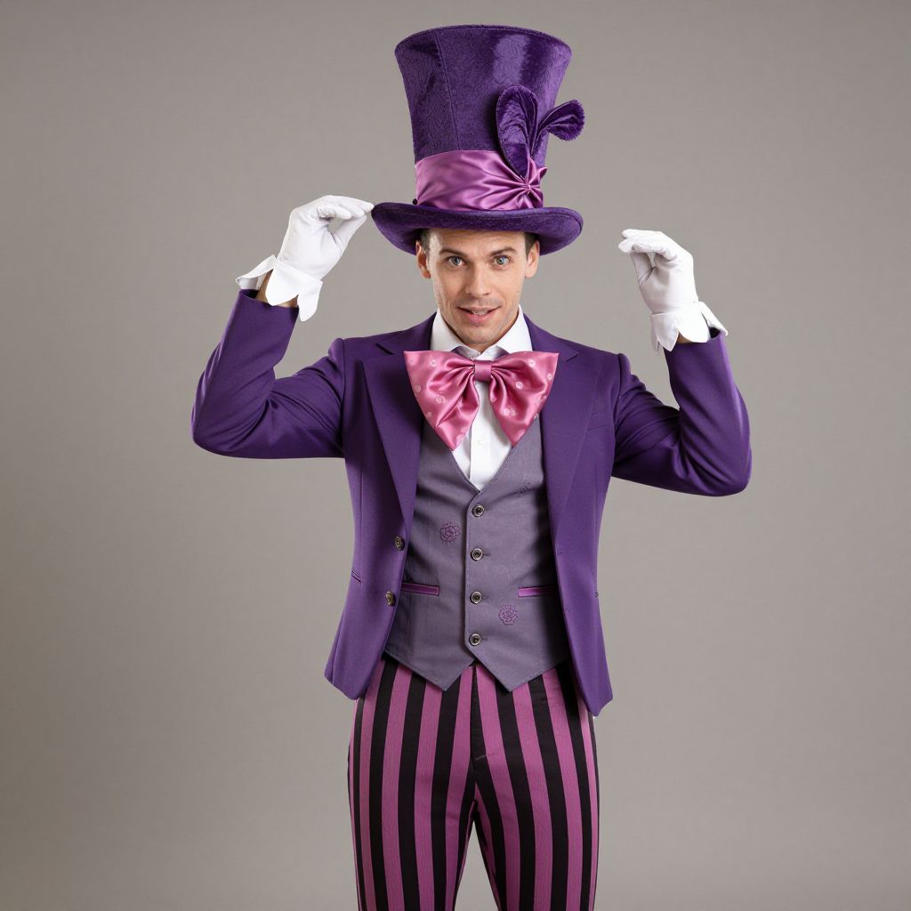 Purple Mad Hatter Costume, man in a purple top hat and striped pants