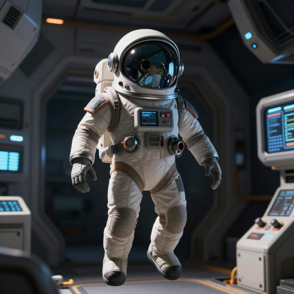 Realistic Among Us character floating in zero gravity inside a damaged spacecraft, fine details on the suit material showing seams and patches, glowing control panels reflected on the helmet, subtle atmospheric dust particles, dramatic volumetric lighting, cinematic realism